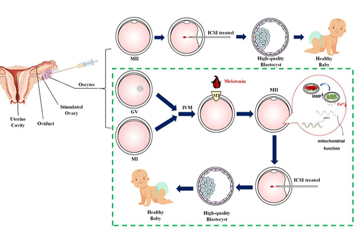 研究团队建立了一套新颖的IVM技术体系(IVM培养液已申报发明专利),有效促进了COH周期中人未成熟卵母细胞的发育潜能,最终获得高比例的优质囊胚,ArrayCGH检测结果证实此类胚胎非整倍体发生率与IVF胚胎相当,临床研究显示此类胚胎可以发育成正常后代。随后,课题组应用单细胞测序和共聚焦荧光染色技术对体外成熟卵子的转录组状况及线粒体功能进行了进一步检测。研究结果表明,褪黑激素可以通过保护线粒体功能来促进COH周期中人未成熟卵母细胞的发育,并最终实现健康后代的出生。