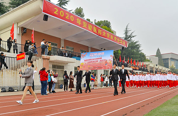 曹云霞在致词中对校运动会的召开表示热烈的祝贺,向全体运动员、教练员、裁判员和工作人员致以最诚挚的问候。她指出,抗击突如其来的新冠肺炎疫情,生命与体育锻炼、全民健身密不可分,举办运动会不仅是全面贯彻党的教育方针、落实全国教育大会精神的必然要求,更是学校全面贯彻“三全育人”教育思想的重要载体,是全校师生医护员工体验体育精神的重要良机以及新时代里推进全民健身的重要途径,对于锻炼师生意志品质,弘扬安医精神,培养德智体美劳全面发展的高素质医学人才具有十分重要的意义。
