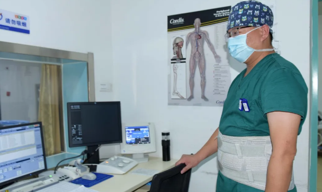 在介入治疗中心导管室,介入医生们都有一双灵巧的手,他们凭借穿刺针、导管、导丝进行微创操作,开通闭塞的血管,点燃脑血管病患者生命之光。为了手术方便,介入医生们穿的铅衣大多设计成分体式,上半身是铅背心,下半身是铅围裙,而为了保证手臂的灵敏度,胳膊、手、脸、眼睛等部位仍然要裸露在外,并不能完全防辐射。