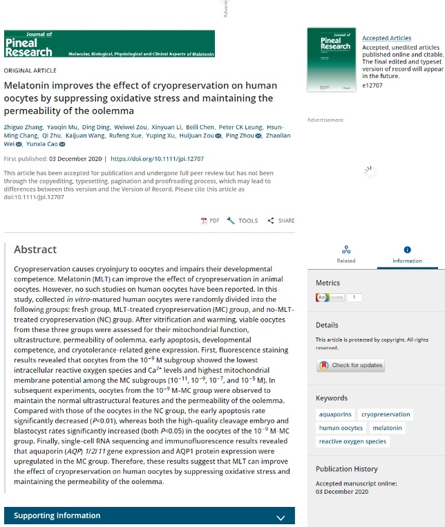 褪黑素主要由松果体分泌,是一种广谱高效抗氧化剂,可以促进超促排卵周期中人未成熟卵母细胞的发育。然而,关于褪黑素能否促进人卵母细胞的冷冻效果及其分子机制的研究鲜有报道。