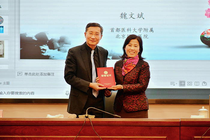 校长曹云霞为魏文斌赠送“杰出校友讲坛”纪念证书。殷泽文 摄