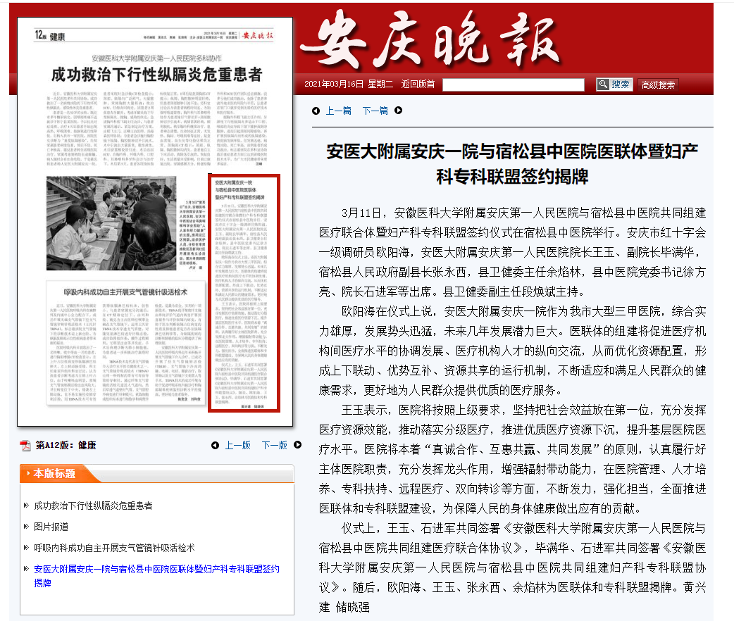 安庆晚报:安医大附属安庆一院与宿松县中医院医联体暨妇产科专科联盟签约揭牌