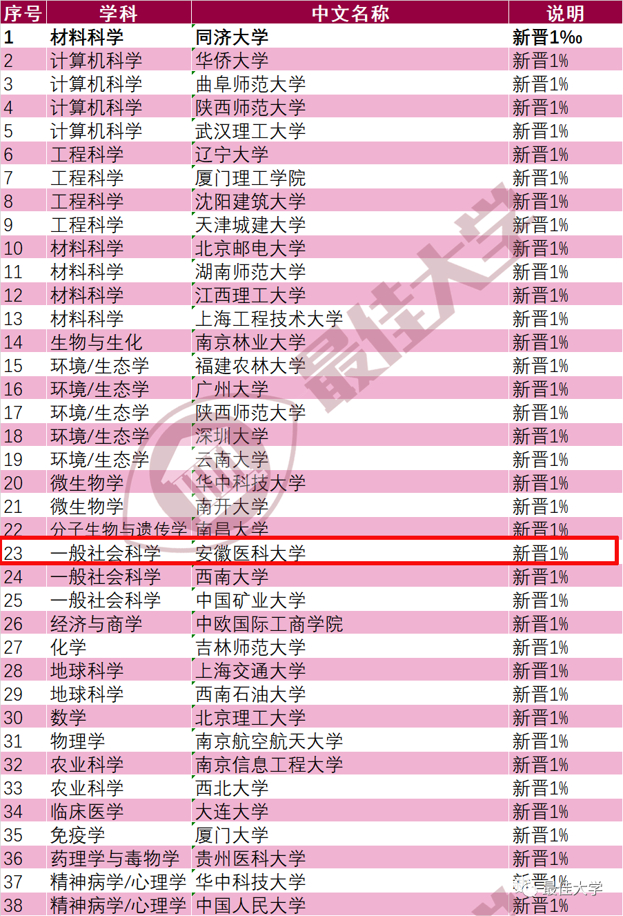 3月25日,科睿唯安公布ESI最新统计数据,我校“社会科学总论”(Social Science, General)学科首次进入ESI全球排名前1%,这是我校社会科学相关学科发展取得的重大突破。至此,学校已有临床医学、药理学与毒理学、分子生物学与遗传学、生物与生物化学、免疫学、神经科学与行为学、社会科学总论等7个ESI全球排名前1%学科,在安徽省属高校中位列第一。