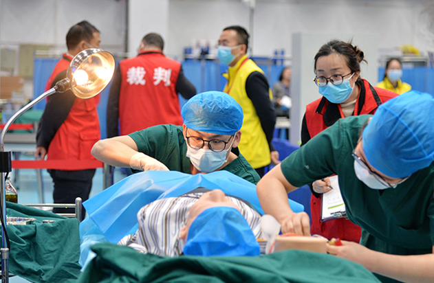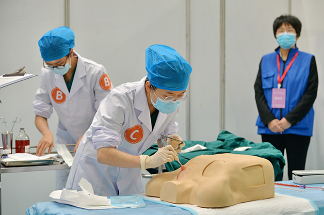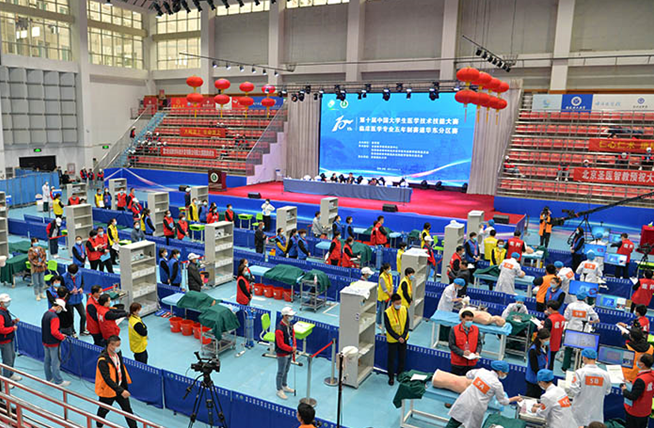 本次竞赛分初赛、复赛、半决赛、决赛四个部分,分别采用多站式、赛道式、单站式进行,考核内容覆盖内科、外科、妇产科、儿科、急诊医学、感染病学、诊断学、基础护理学等临床多个学科,均采用仿真模拟教学模型和标准化病人,高度贴近真实临床情景,以此全面考核医学生的素质、知识、能力以及医学人文和团队合作精神。两日的赛程中,46支参赛队伍激烈比拼,展示了深厚的理论功底和高超的实践技艺,显示了良好的应变能力和高度的团队精神,呈现了一场场精彩的医学盛宴。