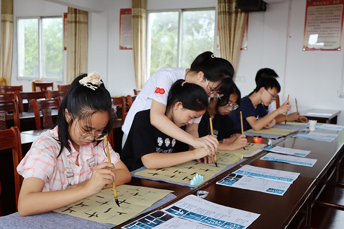 “七彩课堂”上实践队员教小朋友练习书法