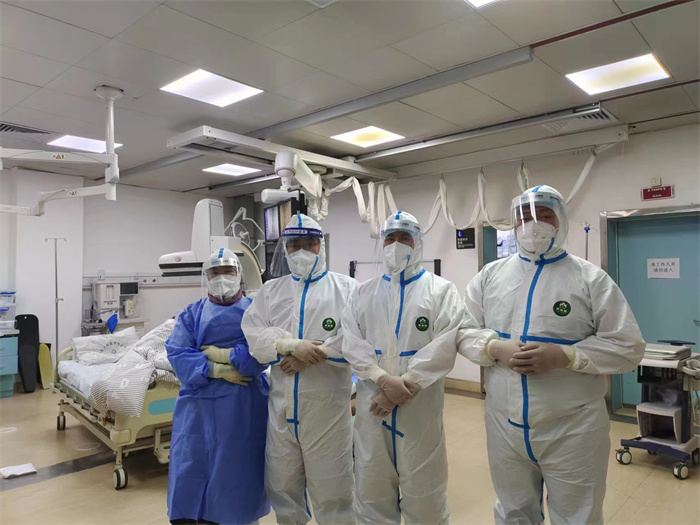 转运至介入中心后,医护人员不但需穿防护服,在防护服外面还需穿着沉重的铅衣,防止射线造成的额外伤害,除此之外,还需穿无菌手术衣以保证手术过程中的无菌环境。