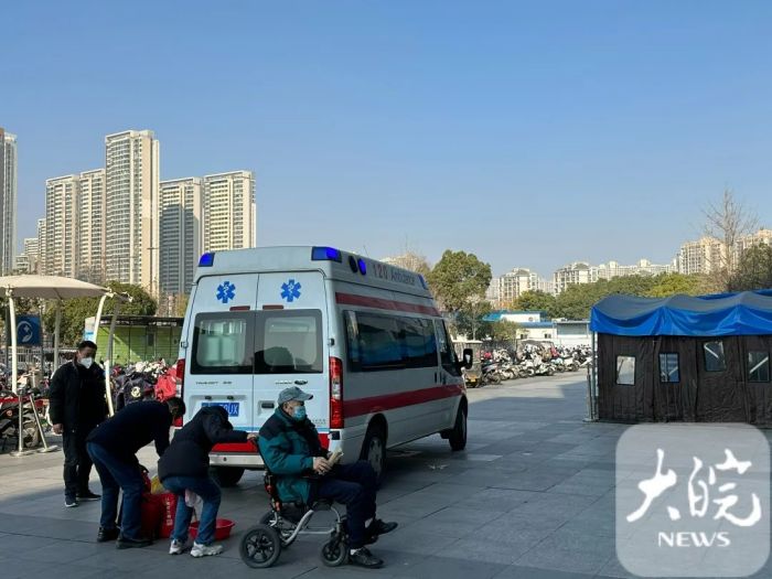 1月3号下午三点半,记者刚到安徽省立医院南区便看到一辆120救护车停在急诊通道外,一位老人在家属的照看下紧急推进急诊抢救室内。而在安徽省立医院南区急诊大厅、走廊则站满了前来就诊的患者和家属,家属一边焦急地和分诊台前的医护人员描述患者的情况一边跑去挂号。与以往急诊室送来的各种外科患者不同,记者看到在几个急诊内科诊室外都排起了长长的队伍,大部分都是坐着轮椅、躺在病床上的老年人。