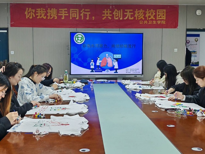 学院还与校医院联合举办宣传活动,进一步加强校园防结核教育工作,营造全体学生参与预防结核的良好氛围,切实促进大学生身体健康。活动现场分为三个区域,在“共享健康,终止结核”文化衫绘制区域,同学们充分查阅资料,在纯白文化衫上创作出一幅幅与防治结核相关的图画并写下宣传标语,表明参与结核防治、创建安全校园的决心。“群策群力,防治结核”黏土DIY活动区域中,同学们发挥想象、积极动手,利用黏土材料制作出有趣的防治结核作品,有趣的作品吸引师生驻足,起到了良好的宣传作用。“防治结核知多少”区域,同学们踊跃回答问题,了解结核病防治知识。