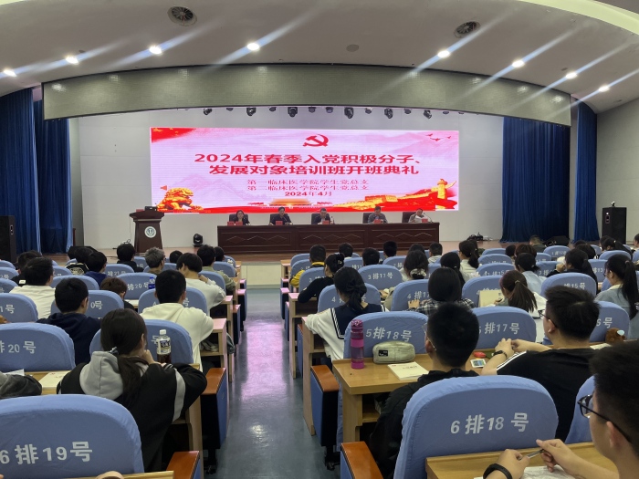 4月11日晚,由第一临床医学院学生党总支、第二临床医学院学生党总支联合举办的2024年春季入党积极分子、发展对象培训班开班典礼,在第一附属医院绩溪路院区内科医技楼四楼报告厅举行。校党委常委、组织部长李阳新出席开班典礼并讲话。第一临床医学院(第一附属医院)党委副书记、学生党总支书记李琮,第二临床医学院(第二附属医院)党委副书记鲍丙刚,第一临床医学院学生工作部副部长孙民出席开班典礼。第一临床医学院学生党总支副书记高晓妹主持典礼。