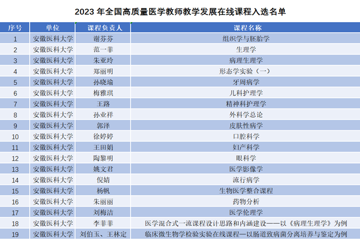 本次评选活动自2023年10月份启动,经学校组织推荐、组委会资格审查、专家网络评审、专家会议评审等系列程序,共评出230门课程入选全国高质量医学教师教学发展在线课程。我校是安徽省内唯一入选的高校,是入选课程数量最多的单位之一。