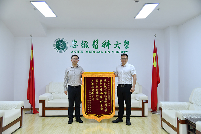 5月8日下午,高新技术企业安徽华沐生物科技有限公司代表一行专程来我校,向学术副校长张智赠送锦旗,祝贺其获六安市“第十二批优秀高校挂职专业技术人才”二等奖,感谢其为企业高质量发展作出的突出贡献。